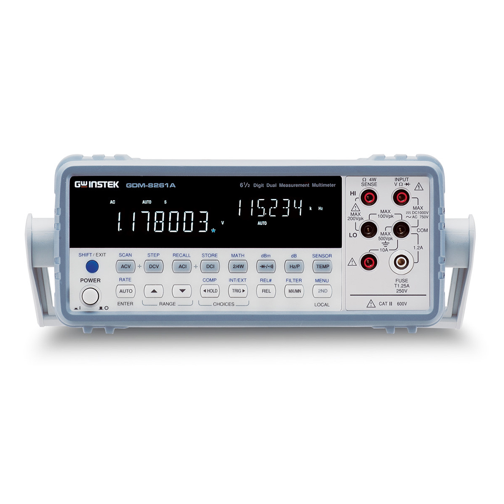 GDM-8261A是一款6 1/2位数字万用表,支持双显示测量,具有11种测量功能和10种运算功能,精度高(35ppm直流电压精度),适合多种应用领域的参数测量。 GDM-8261A采用扫描卡式设计,提供16个V-Ch和2个I-Ch,可以在一个或多个设备上进行多点测量,所有操作仅通过按键完成。拥有多点测量能力,GDM-8261A可以看作一个用于增加生产测试量的半自动ATE系统,或看作一个用于长期监控或特征记录的数据记录器。它的PC软件和DMM-Viewer支持多通道面板设置和扫描卡数据记录。此外,LabVIEW驱动帮助用户在PC屏上创建自己的虚拟仪器,极大的简化了编程。对于ATE系统测量或远程控制应用,GDM-8261A标配USB和RS-232C接口,选配GPIB或LAN接口。 GDM-8261A是一款6 1/2位数字万用表,具有非常高的直流电压精度(35ppm)、双显示测量、11种基本测量和10种高级测量功能。支持外插扫描卡,可以在多个测量点间切换,能够有效进行短期/长期的监控或特征记录。对于系统自身测量或测试需要,GDM-8261A则可使用RS-232C以及凭借高性价比、高速数据获取和操作简单的特性逐渐成为主流的USB接口。 A、操作平台 GDM-8261A所有的基本测量功能,充分满足了工程师设计、研发和测试电子线路或产品的需要,包括电压、电流、电阻、二极管、短路测试以及频率和温度测量。此外,GDM-8261A还具有10种高级测量功能(dBm、dB、比较功能和其它数学运算),让您无需再担心特殊的测量要求。 B、双显示测量 与其它“双显示”数字万用表不同,GDM-8261A的第二个显示屏不仅可以显示范围信息,还可以显示测量值。也就是说,输入信号的两个属性能够同时显示在屏幕上:主要测量和次要测量项目,几乎适合所有的测量组合。双显示测量功能避免在同一个测试点进行多次测量,节省了宝贵时间。 C、高测量分辨率&采样率 模式 分辨率 测量速度 快速 4 1/2位 2,400次/秒 中速 5 1/2位 600次/秒 慢速 6 1/2位 30次/秒 GDM-8261A的分辨率非常高:0.1μV的电压分辨率、100pA的直流电流分辨率、1nA的交流电流分辨率和100μΩ的电阻分辨率,完全可以达到用户对精度的要求。此外,30次/秒(6 1/2位)和2,400次/秒(4 1/2位)的传输速度使GDM-8261足够应对当今市场的测量要求。 D、2/4线制电阻测量 GDM-8261A提供两种电阻测量方法:2线制测量和4线制测量。2线制测量方式是常见简单的连接方法,尤其适用于100Ω~10kΩ电阻。4线制测量方式适合小电阻测量(100Ω以下),测量时会自动补偿测试导线电阻和接触电阻。 E、通用接口&传输速度 为满足系统的应用需求,GDM-8261A提供了一个通用USB接口和一个标准RS-232C接口。连接USB接口,以ASCII格式传输信息的速度可达2,400次/秒。GPIB或LAN卡为选配附件,也可适用于您既有的系统。 F、多点测量扫描卡 选配扫描卡采用插件式设计,具有一套完备的多点测量解决方案,简化了多点测量和数据处理过程。用户可以通过这种扫描方式有效测量与GDM-8261A相连的多个通道。