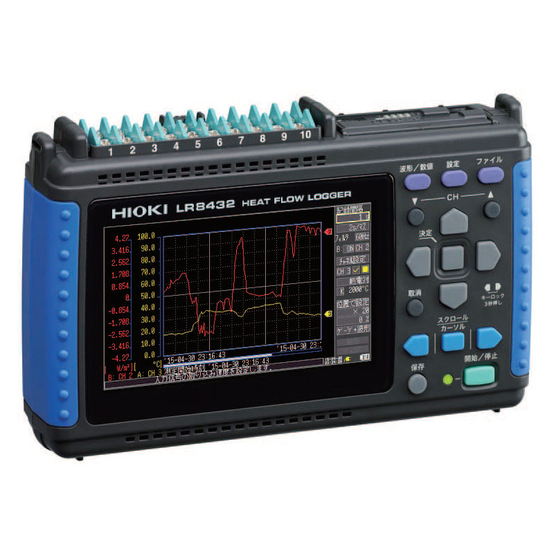LR8432是一款将“热量”可视化的热流数据采集仪。 通过使用热流量传感器将热能传递(热流)和热能量可视化,从而成为温度变化的主要指标。 10ch的数据采集仪,除了热流传感器,还能输入热电偶和电压等。