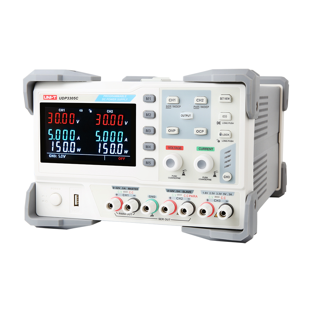 UDP3000C线性直流电源,三路独立输出,两组30V/3A/5A可调输出,一路固定可选输出:电压1.8V/2.5V/3.3V/5V(可微调),电流3A,具有CV与CC模式,短路与过压保护功能,满足多样化的测试需求。