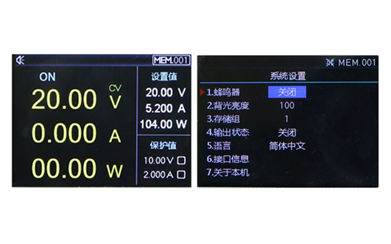 UDP6720系列为用户提供了功能丰富,操作简单的人机交互界面,应用了2.8‘’高清显示屏,可以实时显示电源当前的设定输出电压/电流、实际输出电压/电流和保护输出电压/电流值;同时用户还能够便捷的进行系统的设置,此人性化设置可以满足工程师测试中的多种应用需求。