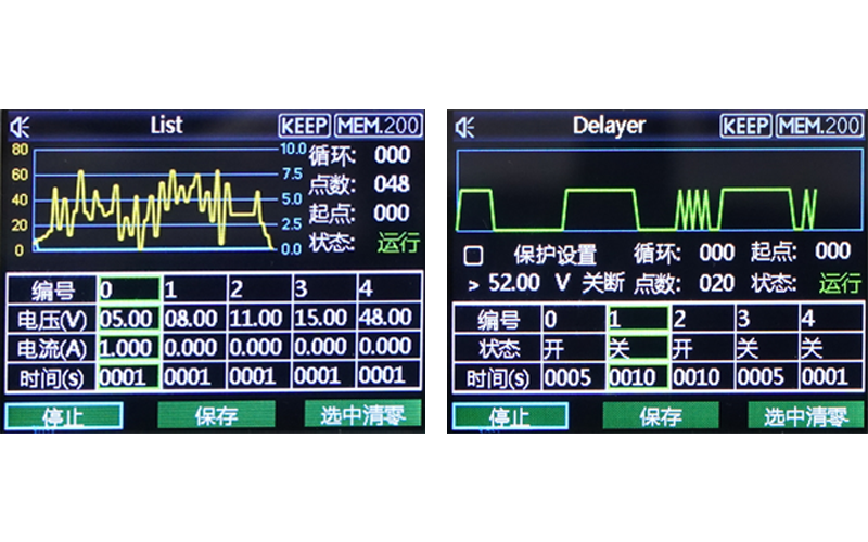 列表模式可设定48组任意电压,电流输出,输出间隔时间可调,还提供输出波形预览与输出循环设置,实现真正可在线编程功能。 延时器功能提供48组开关状态预设,还提供保护电压阈值设置。