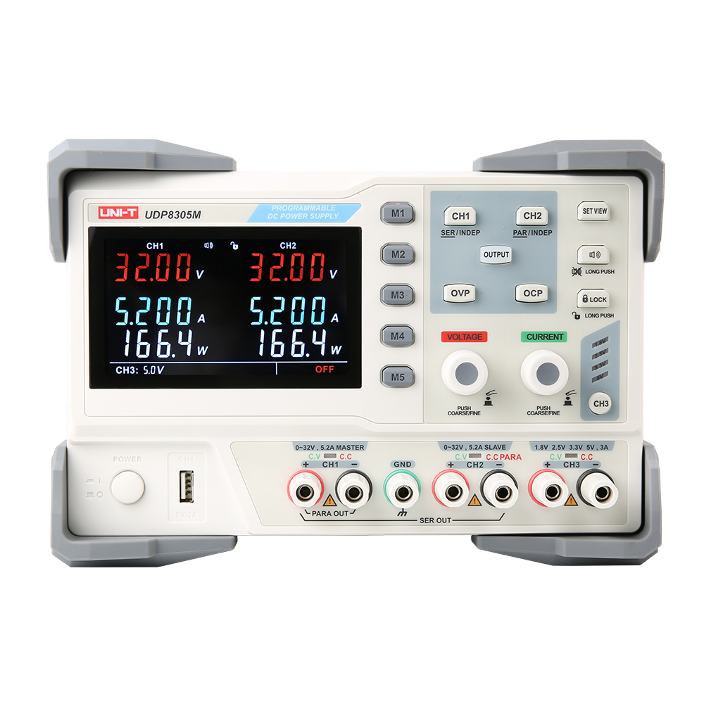 UDP8000M系列可编程直流电源,四路独立输出,两组32V/3.2A/5.2A可调输出,一路固定可选输出:电压1.8V/2.5V/3.3V/5V(可微调),电流3.2A,一组USB(5V/2A)输出,具有CV与CC模式,短路与过压保护功能,满足多样化的测试需求。