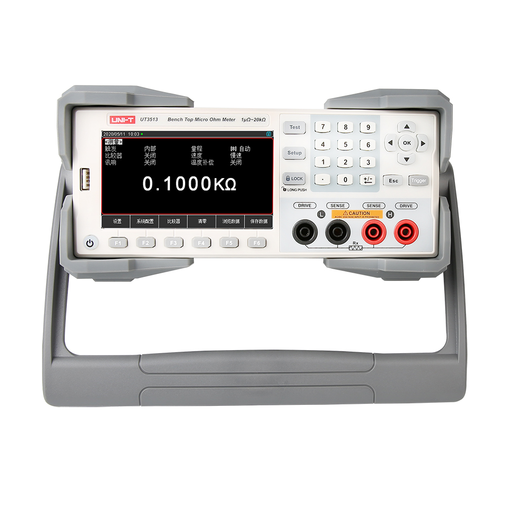 UT3510系列直流电阻测试仪包含UT3513和UT3516两个型号, 其测量电阻范围分别为20kΩ和2MΩ。仪器 4.3英寸大屏幕LCD显示,具备高精度、高分辨率及高速测量特性,拥有0.05%的最高准确度、1uΩ的最小分辨率和60次/秒的最高测量速度。同时标配USB DEVICE、RS-232C和HANDLER通讯接口,支持SCPI和Modbus RTU协议,可与计算机、PLC或WINCE设备进行通讯,高效完成远程控制和数据采集功能。