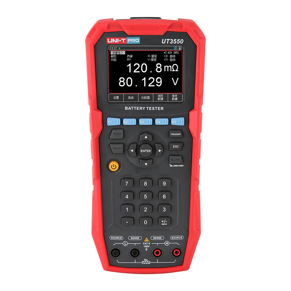 UT3550手持电池内阻测试仪采用高性能微处理器控制,实现全自动实时检测。全新的设计交互体验,兼备了手持表的便携性以及台式仪器的优越性能,是一款高精度、高分辨率的测量仪器。 全新设计的交流电阻测试原理用于电池的内阻测试,包括锂电池、铅酸蓄电池、纽扣电池、氢燃料等各种电池的检测。最新的设计方案,可以直接对UPS进行在线测量,而不损失准确度和稳定性。