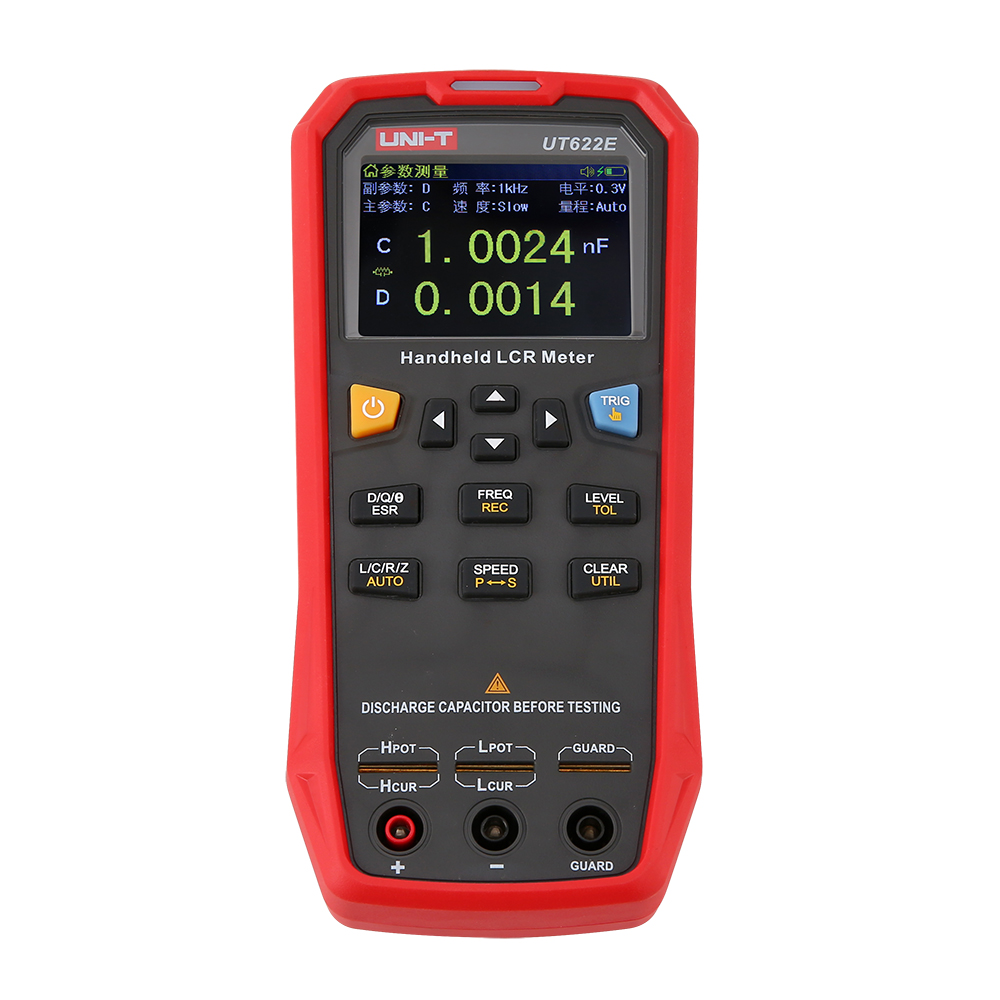 UT622系列LCR数字电桥是用于测量电感、电容、电阻等元件参数的便捷手持式测量仪器,体积小巧,采用 3.7V 1800mAh锂聚合物电池供电或外部电源适配器供电,既可适用于台式机的应用场所,更为流动测量和手持测量场合提供了极大方便。仪器操作简洁直观,测试频率、参数、速度选择即按即现;同时还具备公差模式可进行元件分选,记录模式可辅助获取读数;操作方便的开路短路清零功能提高测量准确性;实用配置菜单可设定按键音、自动关机等操作。
