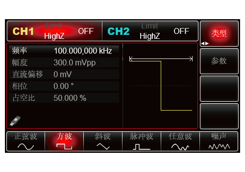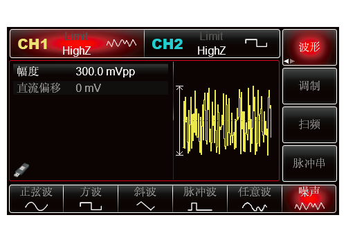 双通道有多种基本波形可选择:正弦波、方波、斜波、脉冲波、谐波、噪声、直流、表达式、任意波形
