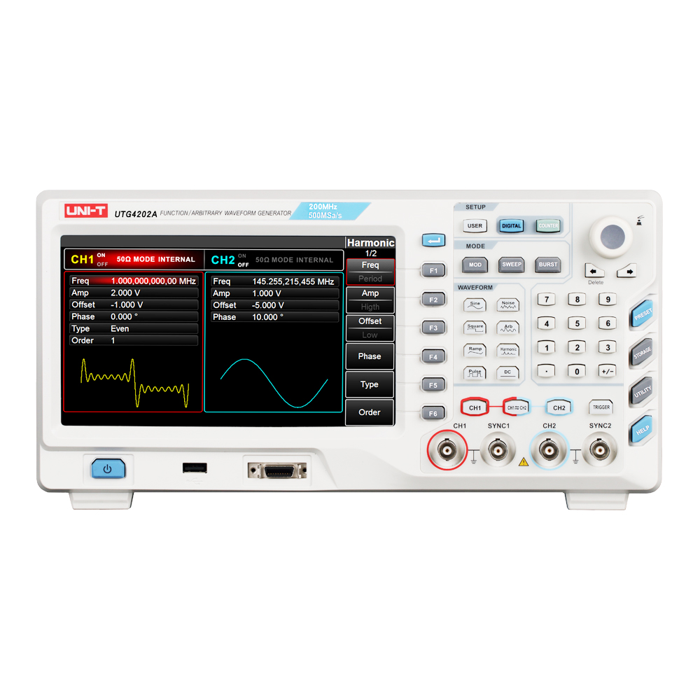 UTG4000A系列集函数发生器、任意波形发生器、脉冲发生器、谐波发生器、模拟/数字调制器、频率计等功能于一体的多功能混合信号发生器;1μHz频率分辨率、以及1mV的幅度分辨率,可生成精确、稳定、纯净、低失真的输出信号,还能提供高频率且具有上升沿和下降沿1ns分辨数字合成的脉冲波。独立等性能双通道设计,最高实时采样率高达500MS/s,最大任意波长度高达32Mpts,同时具备7GB非易失波形存储;国内首款选配数字信号发生器输出模块;超宽8英寸LCD高清屏显示,人性化的界面设计及合理的功能键盘布局,给用户带来更为人性化的使用体验。