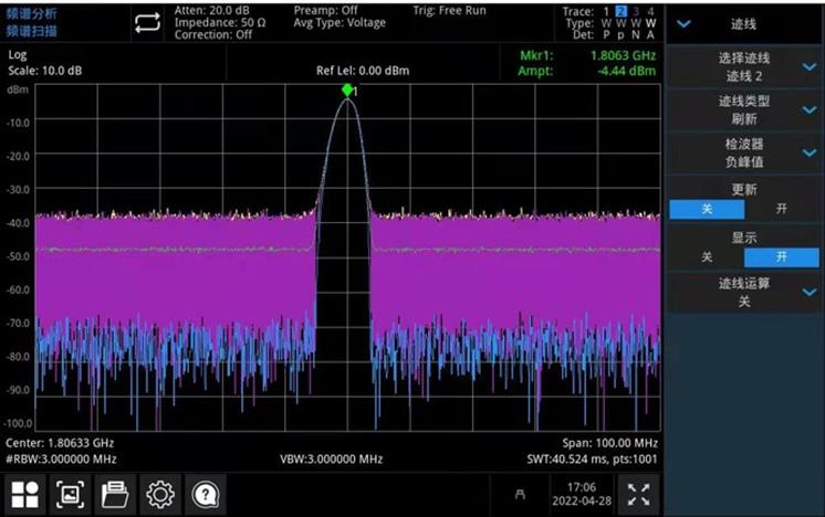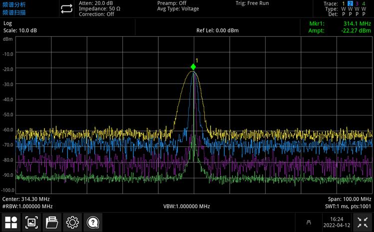 通过不同颜色的迹线清晰观察比较改变RBW后的频谱变化