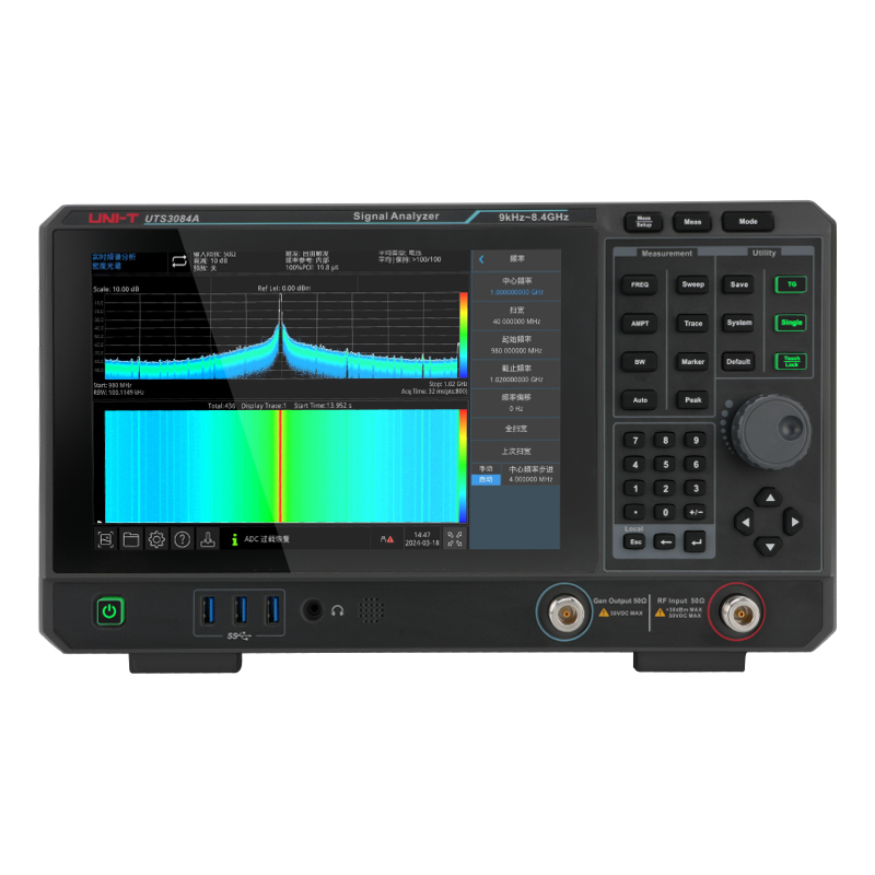 UTS3000A系列信号分析仪的最高测量频率范围可达9kHz~8.4GHz;实时频谱信号分析带宽最高到40MHz,全幅度精度<0.7dB,显示平均噪声电平<-161dBm,相位噪声<-98dBc/Hz,扫描点数最高40001点,最小分辨率带宽1Hz,拥有非常强大的频谱分析和实时信号分析能力;支持高级测量、EMI分析、IQ信号分析、LTE分析、5GNR信号分析及矢量网络分析(VNA),能让用户掌握被测信号全方位的动态及细节,呈现完美的测试效果和提供更佳的解决方案。广泛应用于电子研发与制造业,无线通信测量,射频微波研发,电磁兼容预扫,半导体测量等众多应用场景中。