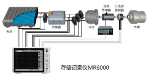 使用MR6000的X-Y显示功能,测量马达特性。在马达开发或使用马达的应用方面,从启动到停止的运动过程中,检查转矩,马达功率,马达效率和变频器输出功率是否随电机的转速变化。比如,转数设为X轴,通过X-Y显示分析每个转数的行为。
