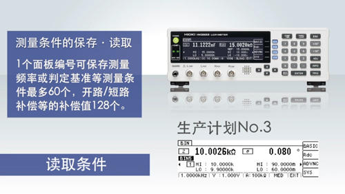 为了使用1台LCR测试仪测量多种产品,要求高效率的更改设置。 IM3523的面板保存功能更,最多保存60组测量条件,还能保存128个开路/短路补偿和线长补偿等的补偿值。使用面板功能读取所保存的测量条件。除了手动读取以外,可以使用外部控制端口控制面板编号的读取,因此能缩短构筑自动化检查产线的时间。